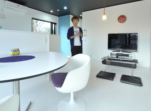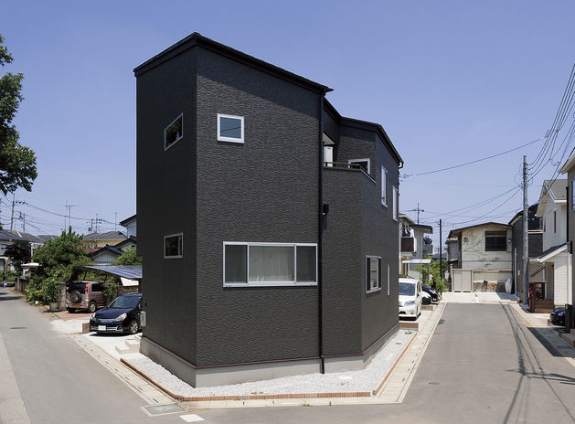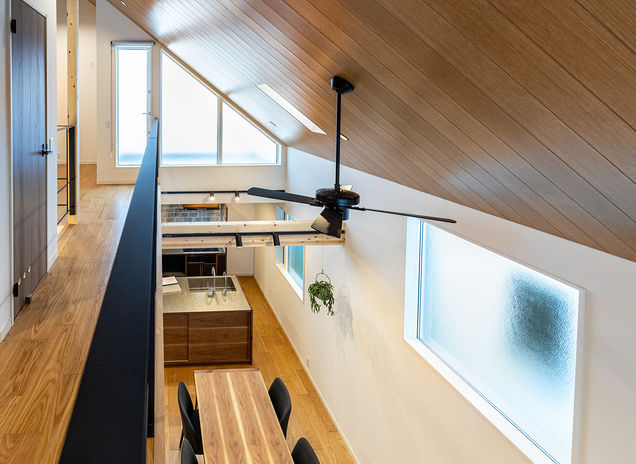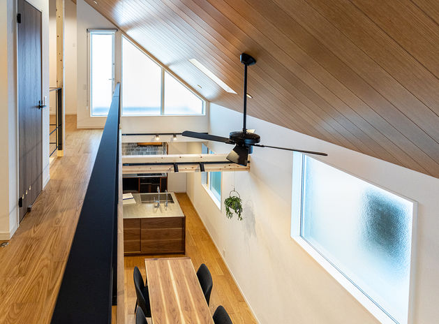 敷地条件にとらわれず、自由な発想でプランニングできるのがイオスホームの強みのひとつ。写真の実例では五角形に近い変形地に、敷地を有効活用した「くの字」のような形状の2階建てを設計した。道路に囲まれた立地のため、外部からの視線が室内に届かないよう、窓の位置を高めに。十分な光を取り入れながらも、周囲を気にせずのびのびと暮らせる住まいとなった。