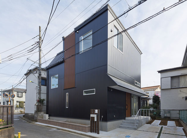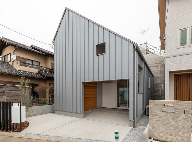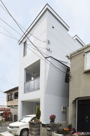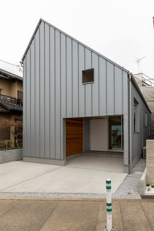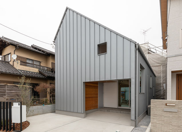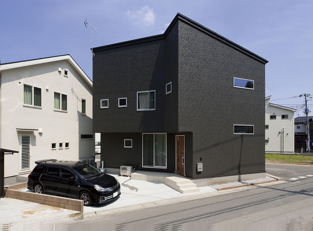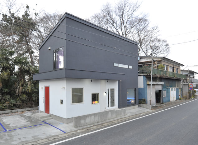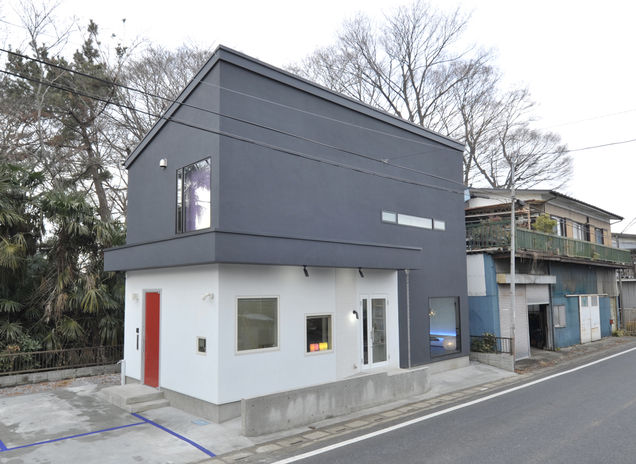 スタイリッシュでひときわ目を引くイオスホームの施工物件。大胆な素材使いやプライバシーに配慮した開口部の設計が特長だ。店舗併用住宅の事例では、2色の塗り壁に赤い玄関ドアでアクセントをプラス。一見、住宅に見えないようなシャープな印象に仕上がった。