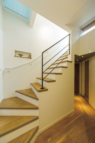 さらさらと肌ざわりがよく、健やかな空気を作り出す無垢材。イオスホームでは、要望があればこうした自然素材の使用も可能だ。写真の実例では床と階段の踏み板にオークを用いた。ほどよく節のある材の優しい表情が、ナチュラルな雰囲を醸し出している。硬質なアイアン素材との相性も抜群だ。