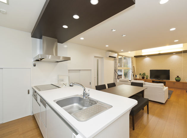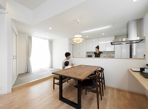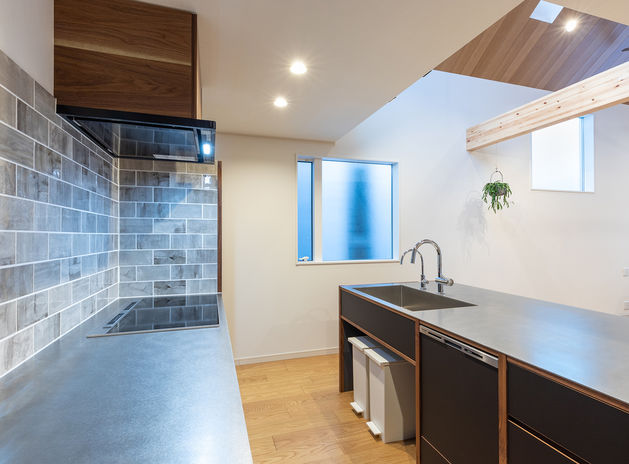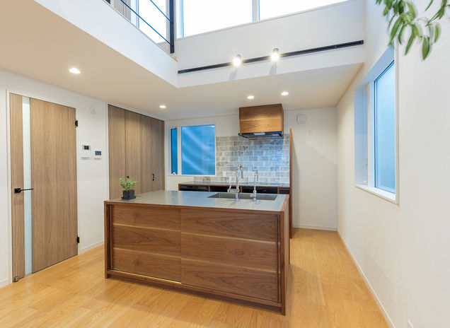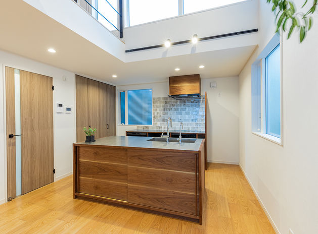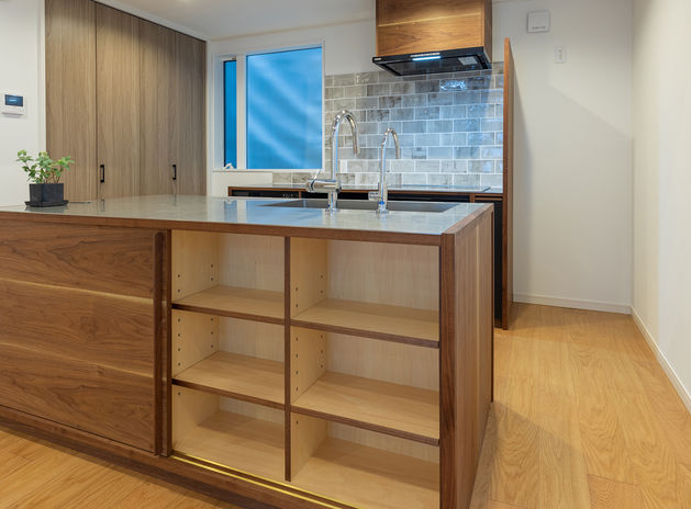 イオスホームは、料理や洗濯がしやすいよう、家事効率に配慮した家づくりも得意。家事動線や細かい収納の工夫はもちろん、最近はオーダーメイドのキッチンにも力を入れている。それぞれの間取りや使い方にピッタリなキッチンを製作でき、家族みんなでのびのび使えるので、食事の準備が楽しくなる。