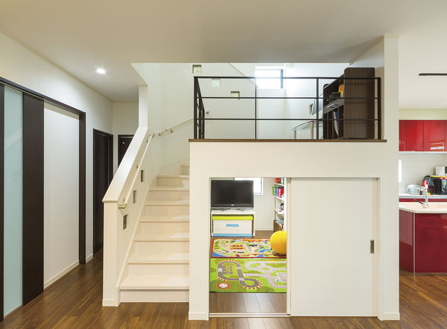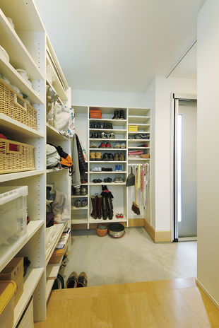 収納スペースの確保は注文住宅設計の一つの要だ。イオスホームではやみくもにスペースを設けるのではなく、「適切な場所に適切な量」を意識して提案している。写真の実例ではスキップフロアの段差を利用して、お子さんの遊び場を兼ねた納戸を設計した。玄関収納は高さの変えられる可動棚で靴の高さにフィット。そのほか、1階にファミリークローゼットを設けて家族の衣類をまとめるプランも人気だという。