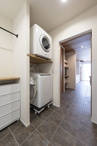 イオスホームでは施主の7割以上が共働き世帯だという。そのため家事効率に配慮した間取りの提案や設備の提案が得意だ。写真の実例では、ダイニング隣接したキッチンにパントリー、洗濯脱衣室、洗面、浴室を直線状に配置。脱衣室には室内干しスペースとファミリークローゼットを設計した。さらに回遊できる動線を取り入れ、忙しい時間帯もスムーズに家事をこなせるように工夫されている。