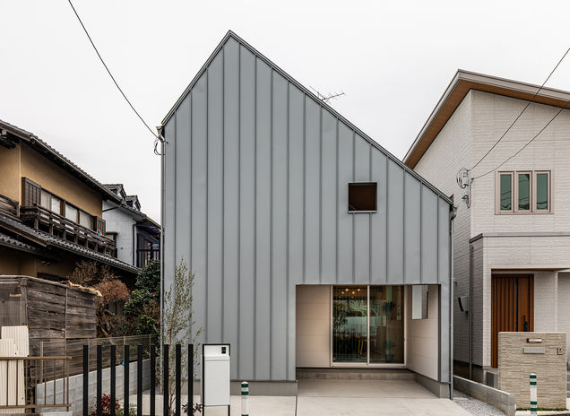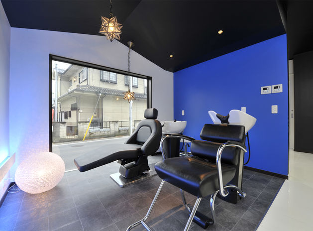 イオスホームではこれまで20棟以上の店舗併用住宅を施工している。写真は1階を美容室、2階を自宅とした施工例。同社の提案で、スクエアのFIX窓などスタイリッシュな部材を用い、住宅というよりも店舗のイメージを印象づけている。コストを抑えるためにコンパクトにまとめているが、シャンプー台など必要な設備の寸法を正確に測ることで使い勝手が悪くならないよう調整した。細やかな工夫が多くの施主に喜ばれている。