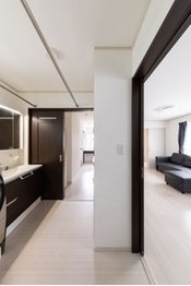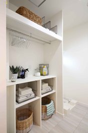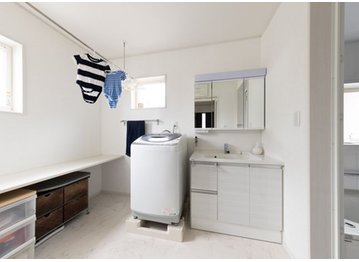 まだ子どもが小さく目が離せないMさん邸(左写真)では、洗濯物を素早く干せるランドリースペースを洗面室に設けた。小学生・中学生の子どもがいるOさん邸(右写真)では、玄関から洗面室を通ってリビングに入る動線をつくった。これによって部活帰りの子どもたちも、まず汚れたものを洗濯機に入れる習慣が身についたという。このような、家族のかたちに合わせた細かな心配りが、同社の間取りプランには表れている。