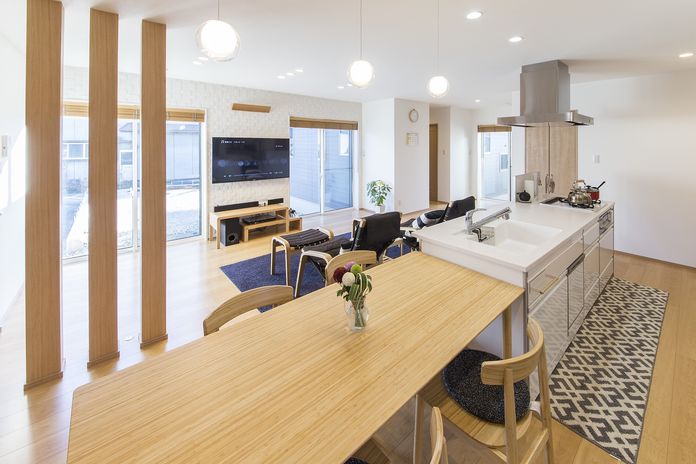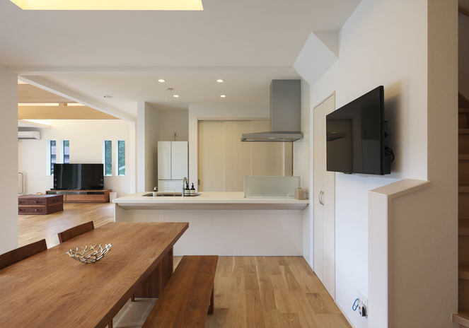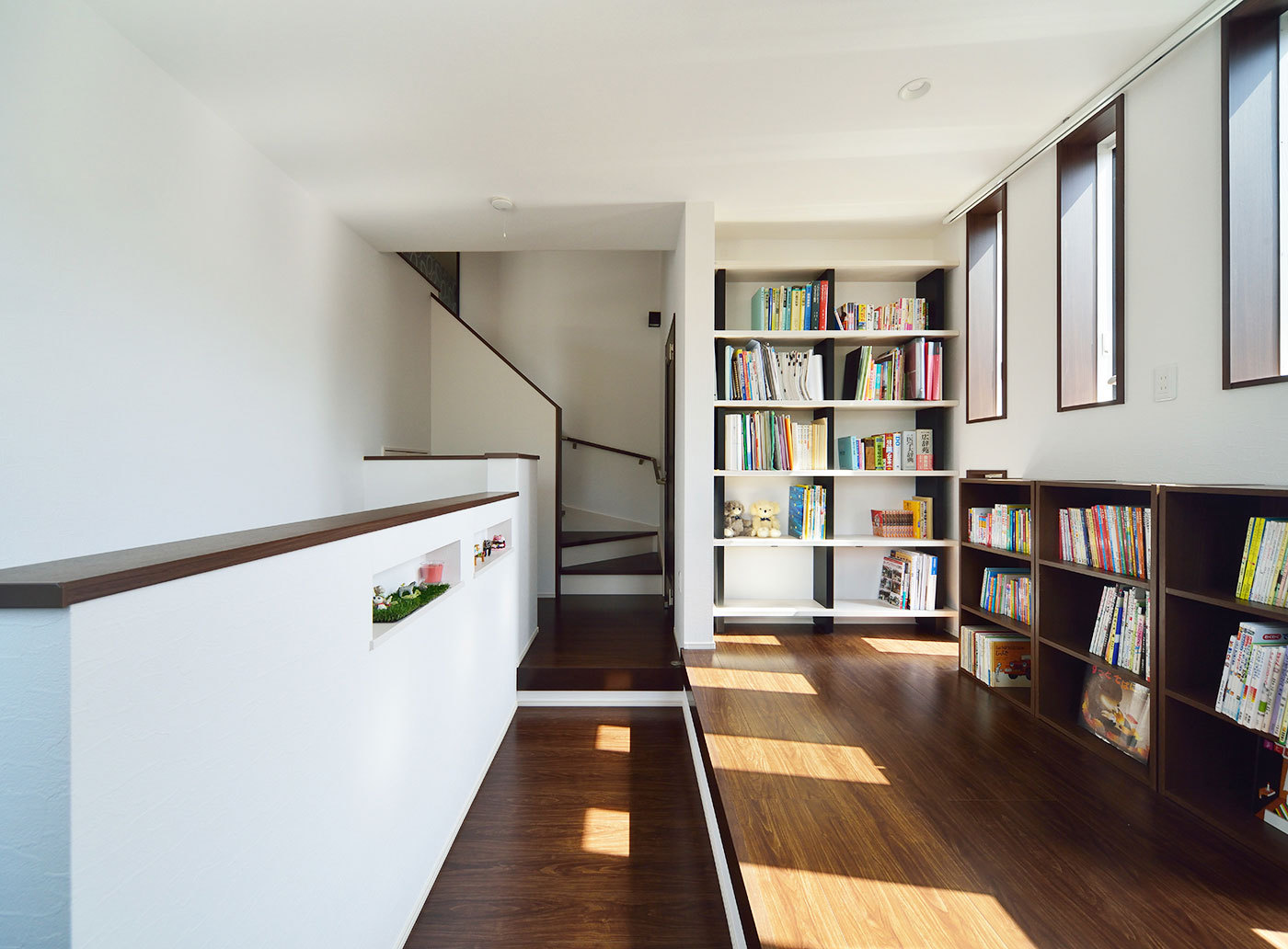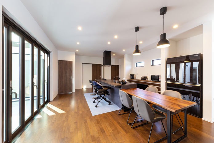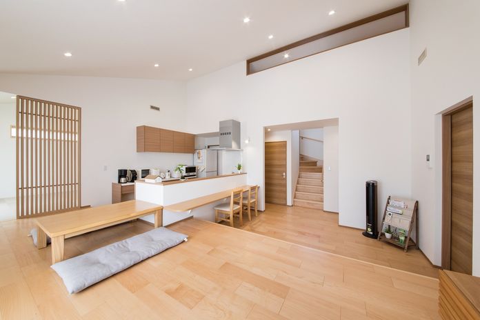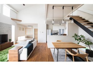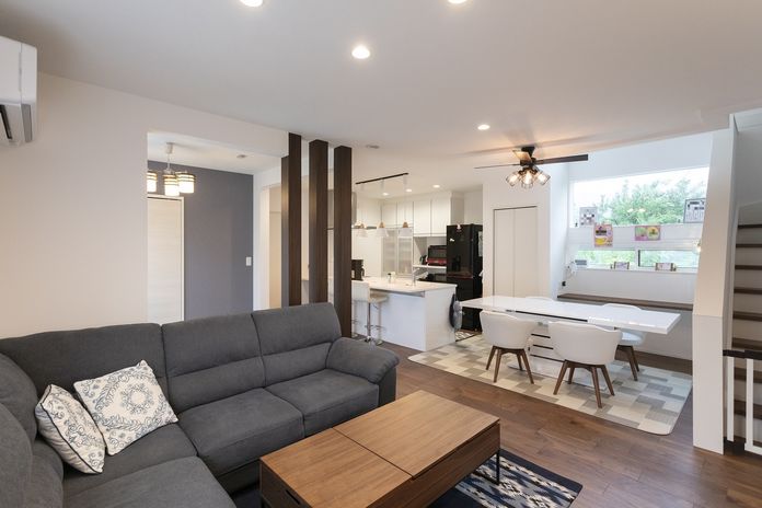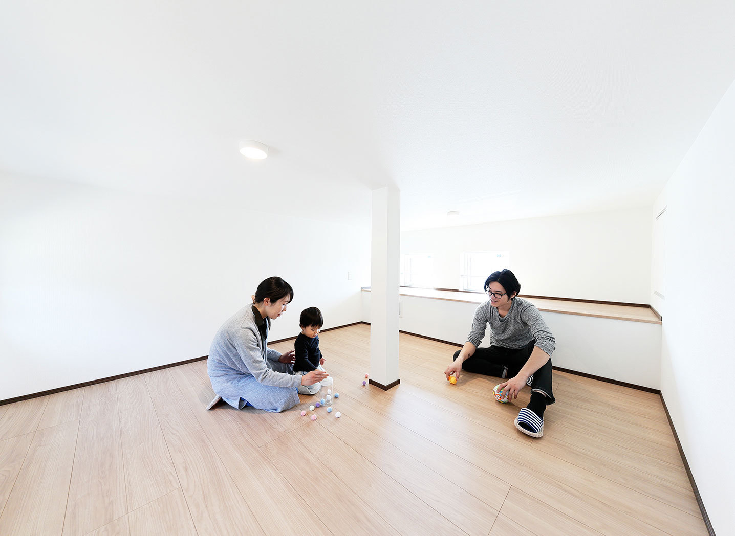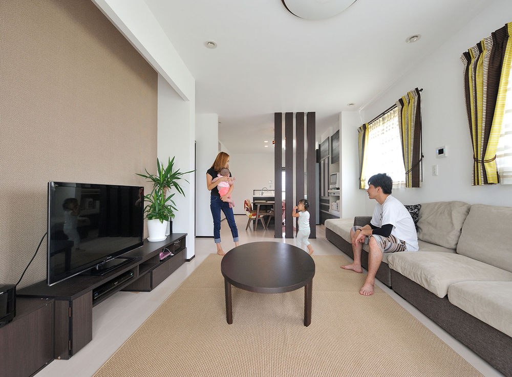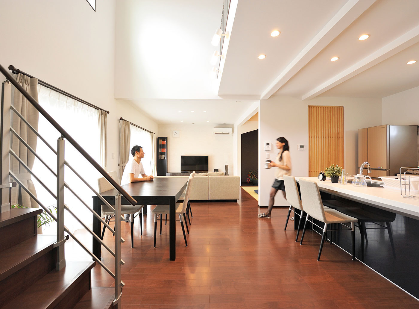 [夫32歳+妻+子供] なにかと来客が多い子育て世代。子供達が広々空間で遊べるよう、和室と寝室に大収納スペースを設け、見えない収納を実現。余分な物が出ていないことで、お気に入りの家具が引き立ち、センスあふれる空間が完成。さらに敷地を有効活用し、仕切りも最小限に抑えている為、どの部屋も開放感の有る広いスペースを確保。特に天井の高いリビングでは、おしゃべりをしていても子供達の遊んでいる声が気にならない。
